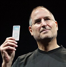 Apple CEO Steve Jobs holds up the new iPod Nano after introducing it at an event in San Francisco, California September 7, 2005. The nano weighs 1.5 ounces and is one-fifth the size of the original iPod. Apple Computer